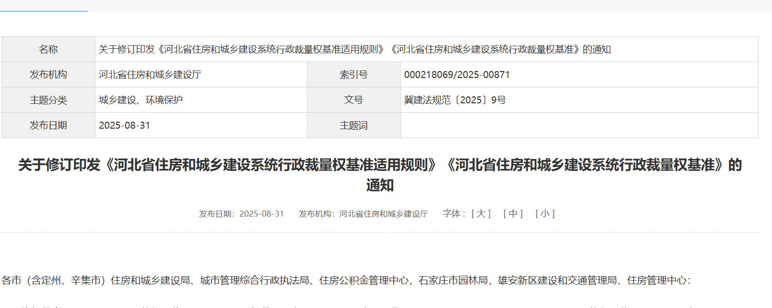 2025年8月31日,河北省住房和城乡建设厅印发修订后的《河北省住房和城乡建设系统行政裁量权基准适用规则》,自2025年9月1日起施行。...