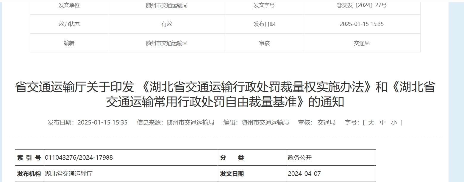 为进一步规范全省交通运输行政处罚裁量权的行使,维护公民、法人和其他组织的合法权益,省交通运输厅组织制定了《湖北省交通运输行政处罚裁量权实施办法》和《湖北省交通运输常用行政处罚自由裁量基准》,现予印发,...