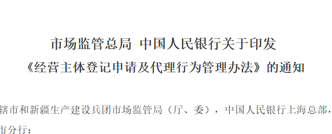 市场监管总局会同中国人民银行制定了《经营主体登记申请及代理行为管理办法》,现印发给你们,请遵照执行。 ...