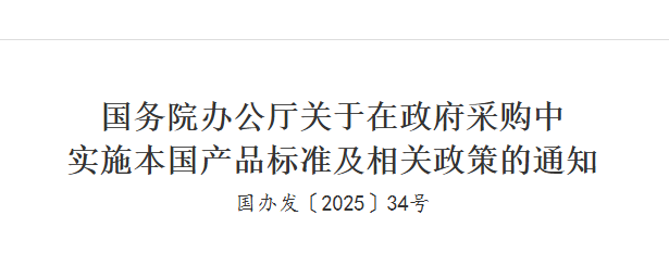 国务院办公厅关于在政府采购中 实施本国产品标准及相关政策的通知 国办发〔2025〕34号 各省、自治区、直辖市人民政府,国务院各部委、各直属...