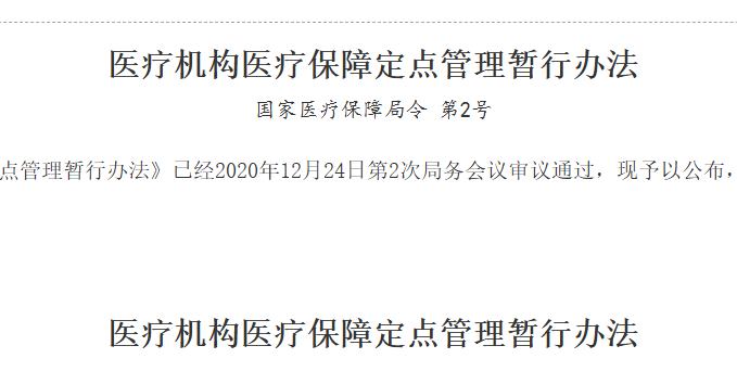 《医疗机构医疗保障定点管理暂行办法》已经2020年12月24日第2次局务会议审议通过,现予以公布,自2021年2月1日起施行。...