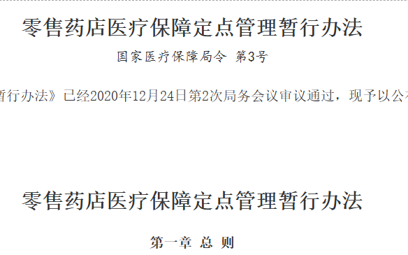 《零售药店医疗保障定点管理暂行办法》已经2020年12月24日第2次局务会议审议通过,现予以公布,自2021年2月1日起施行。...