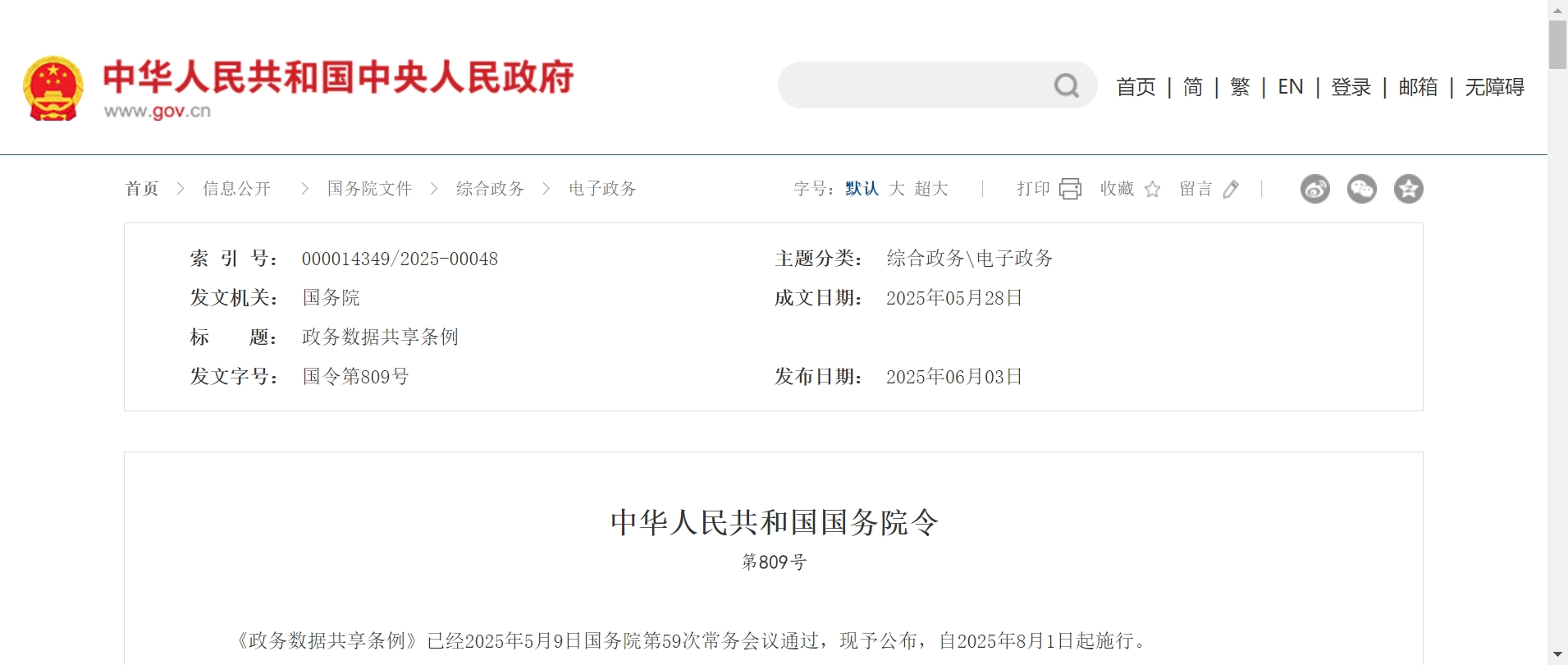 《政务数据共享条例》已经2025年5月9日国务院第59次常务会议通过,现予公布,自2025年8月1日起施行。...