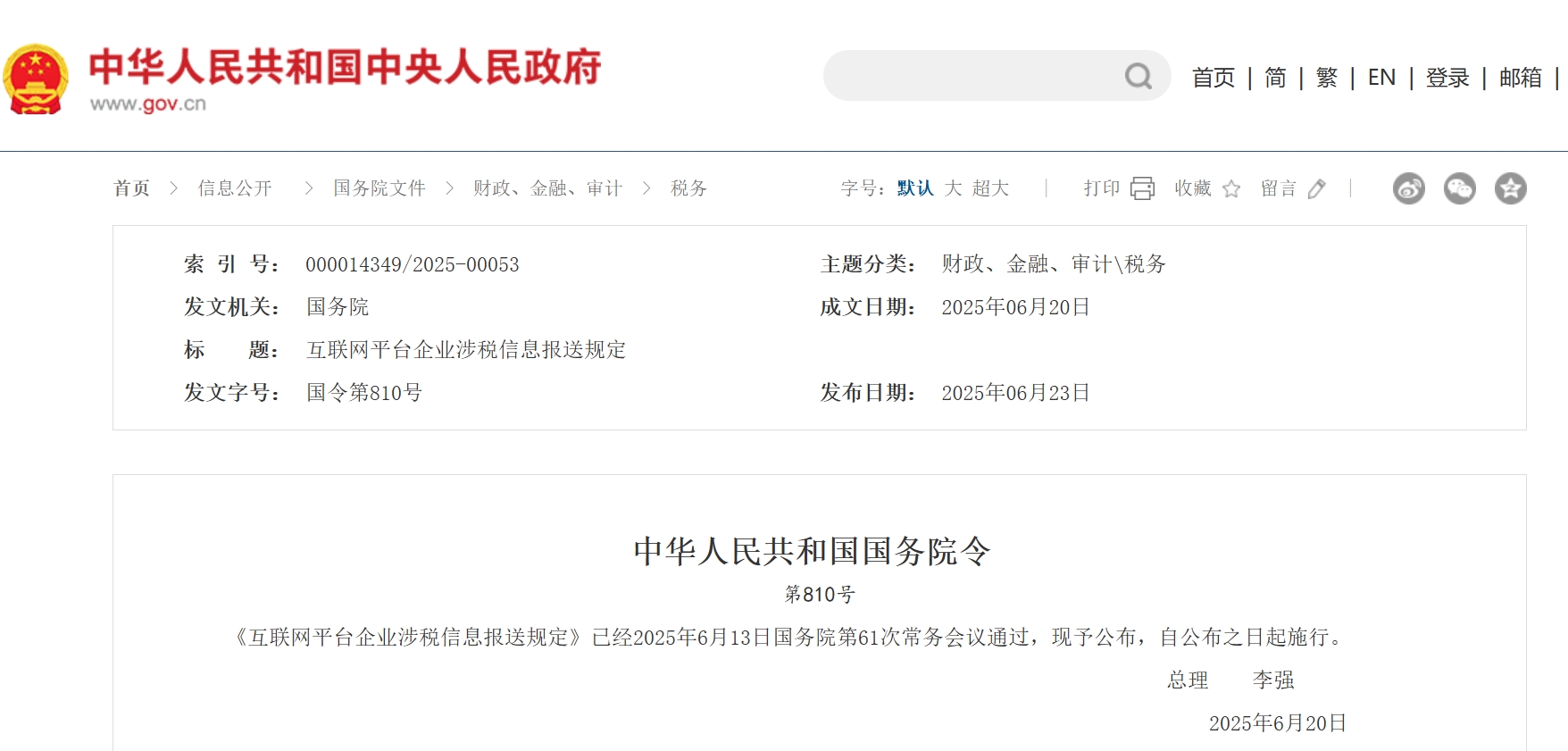 《互联网平台企业涉税信息报送规定》已经2025年6月13日国务院第61次常务会议通过,现予公布,自公布之日起施行。...