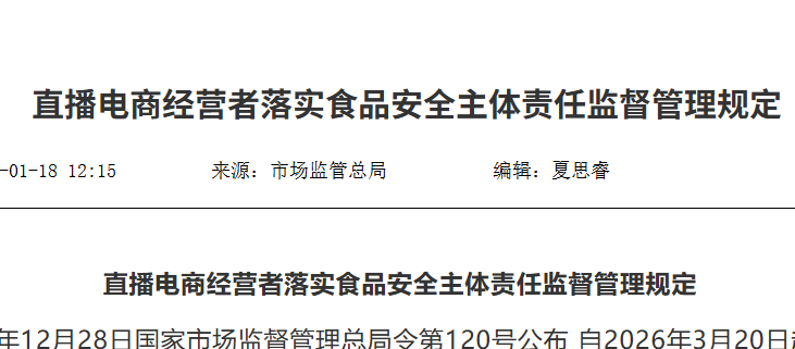为了加强食品直播电商活动监督管理,督促直播电商经营者落实食品安全主体责任,保证食品安全,根据《中华人民共和国食品安全法》、《中华人民共和国电子商务法》等法律、行政法规,制定本规定。...