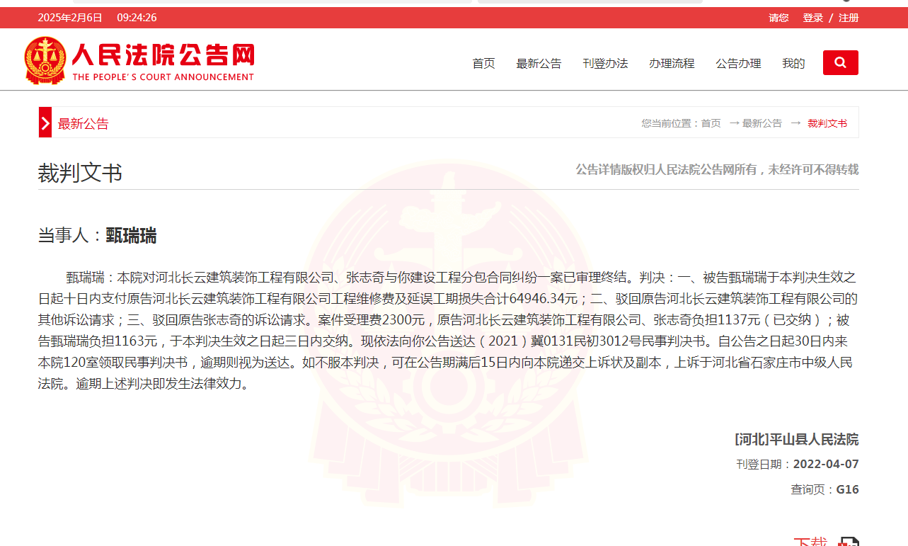 甄瑞瑞:本院对河北长云建筑装饰工程有限公司、张志奇与你建设工程分包合同纠纷一案已审理终结。判决:一、被告甄瑞瑞于本判决生效之日起十日内支付原告河北长云建筑装饰工程有限公司工程维修费及延误工期损失合计64946.34元:二、驳回原告河北长云建筑装饰工程有限公司的其他诉讼请求;三、驳回原告张志奇的诉讼请求,案件受理费2300元,原告河北长云建筑装饰工程有限公司、张志奇负担1137元(已交纳);被告甄瑞瑞负担1163元,于本判决生效之日起三日内交纳。现依法向你公告送达(2021)翼0131民初3012号民事判决书。自公告之日起30日内来本院120室领取民事判决书,逾期则视为送达。如不服本判决,可在公告期满后15日内向本院递交上诉状及副本,上诉于河北省石家庄市中级人民法院。逾期上述判决即发生法律效力。