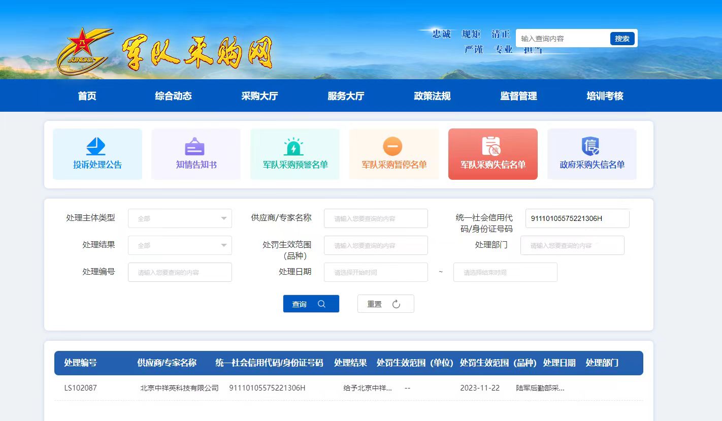 处罚标准:根据《军队物资工程服务供应商管理规定(试行)》,拟给予①重庆旷维科技有限公司、四川博全科技有限公司、北京中祥英科技有限公司3年内禁止参加陆军部队采购活动的处罚。