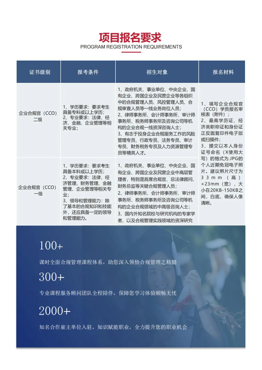 六、培训证书发放参加培训并通过考核的学员,将获得人力资源和社会保障部社会保障能力建设中心颁发的企业合规官(CCO)培训证书。证书可在人力资源和社会保障部教育培训网进行查询。七、报名及联系方式(一)报名材料及要求:1.填写报名审核表(联系报名咨询老师或地方招生服务机构索取);2.最高学历证、经济类职称证和身份证正反面复印件电子版3.提交以本人身份证号命名(X使用大写)的格式为.JPG的个人近期免冠电子照片。建议照片尺寸为33mm(高)×23mm(宽),大小在20KB-150KB之间,白底,确保人像清晰。